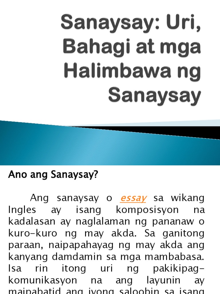 Ang mga sanaysay ay may layong magbahagi ng impormasyon magpahayag ng nararamdaman magbahagi ng opinyon manghikayat ng ibang. Ang coronavirus na ito ay karaniwang natatagpuan sa mga hayop lamang at hindi pa nakita. ANG PINAGMULAN NG SANAYSAY 1580-nagsimula ang tinatawag na sanaysay dahil sa katipunan ng mga palagay at damdamin ni Michael de Montaigne isang Pranses na pinamagatang Essais.