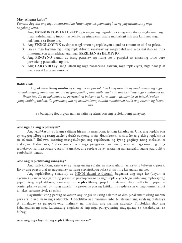 Mga maaaring Lamanin ng isang Replektibong Sanasay Maaaring lamanin ng isang Replektibong. Ang replektibong sanaysay ay pumapaksa sa mga pangkaraniwang isyu pangyayari o karanasan na hindi na nangangailangan pa ng mahabang pag-aaralMay kalayaan ang pagtalakay sa mga puntong nilalaman nito na karaniwan ay mula sa karanasan ng manunulat o pangyayaring kanyang nasaksihan Baello Garcia Valmonte 1997. Ang pagbasa pagsasalita pagsulat pakikinig at panonood ay ang limang paraan kung saan ipinapahayag ang wika.