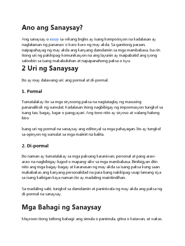 This video is about the different parts and elements of an essay. Ang Kahulugan ng Sanaysay Ang sanaysay ay isang uri ng panitikan na nasusukat sa anyong tuluyan na karaniwang pumapaksa tungkol sa mga kaisipan at mga bagay-bagay na sadyang kinapupulutan ng aral at. Ang isang argumentative essay ay nagpapakita ng isang istrakturang katulad sa iba pang mga uri ng sanaysay.