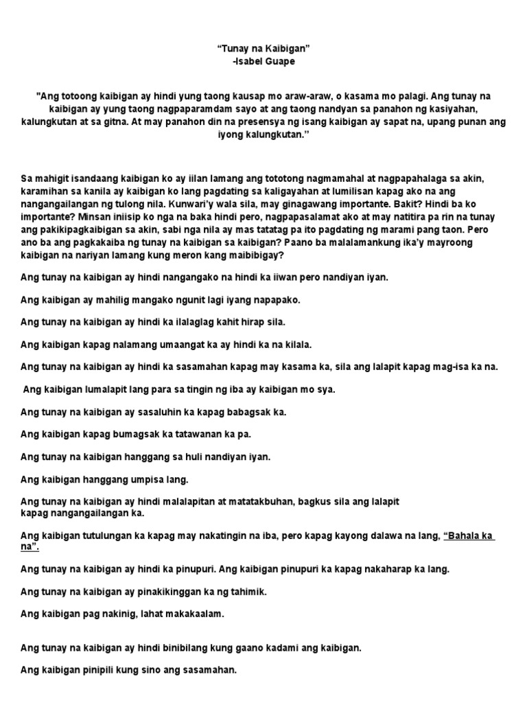 Kapag ganyan ang taong kaibigan mo masasabi mo na siya ang tunay mong kaibiganNaaalala ko tuloy ang isa kong kaibigan siya ang kaisa-isang tao na naging kaibigan ko nung time na down na down ako siya yung taong nasa likuran ko nag-papalakas ng aking loob taong nagtuturo sa akin taong tumutulong sa akin sa aking kagipitan taong itinuring. Dahil sa dami ng nilalang sa mundo hindi naman lahat ay magiging kaanak natin at hindi lamang sila ang makasasalamuha natin. Iyan man ay marami at halos di mabilang o kahit pa nag-iisa lamang ang importante ay mayroon tayong kaibigan na nakakasama natin sa lungkot sa saya o sa problema man.