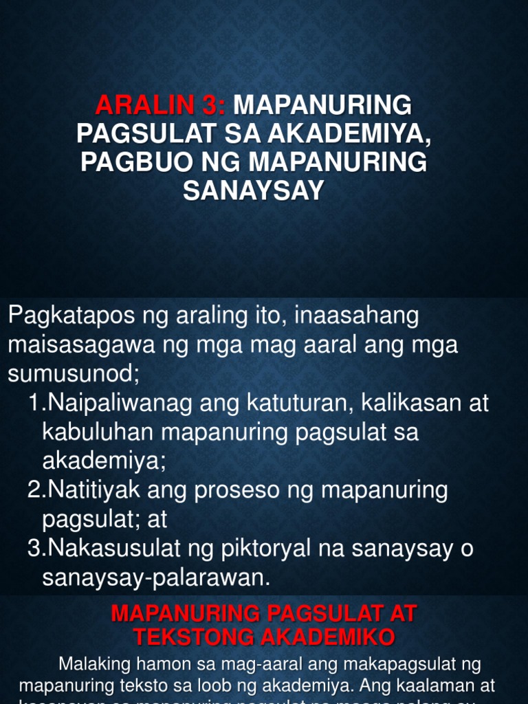 Mula sa pagiging personal ng akda ay papasukin na nito at bubusisihin ang ibat ibang anggulo na maaaring sangkot sa usapin. Pagkakaugnay ng Introduksiyon katawan at konklusyon dapat matiyak sa pagsulat ng mapanuring akademikong teksto ang kaisahan kabuuan at wastong salita at kataga upang makompleto ang kahulugan sa loob ng talata. REPLEKTIBONG SANAYSAY Sa paksang ito ating tatalakayin kung ano nga ba ang replektibong sanaysay at ang mga halimbawa nito.