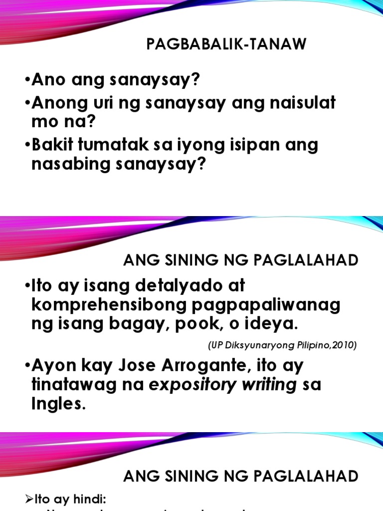 Mga Dapat Isaalang-alang sa Pagsulat ng Replektibong Sanaysay. Tiyak na paksa unang panauhan magtaglay ito ng patunay o patotoo pormal na salita tekstong naglalahad.