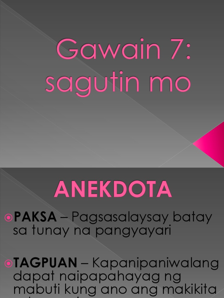 Una sa lahat atin munang alamin kung ano nga ba ang isang anekdota. Sa pamamagitan ng isang sanaysay makakakuha ang mambabasa ng isang komprehensibong pag-unawa sa paksa. Sa tula at sanaysay mariing ipinapahayag ng manunulat ang damdaming umiiral habang isinusulat ang kanilang akda.
