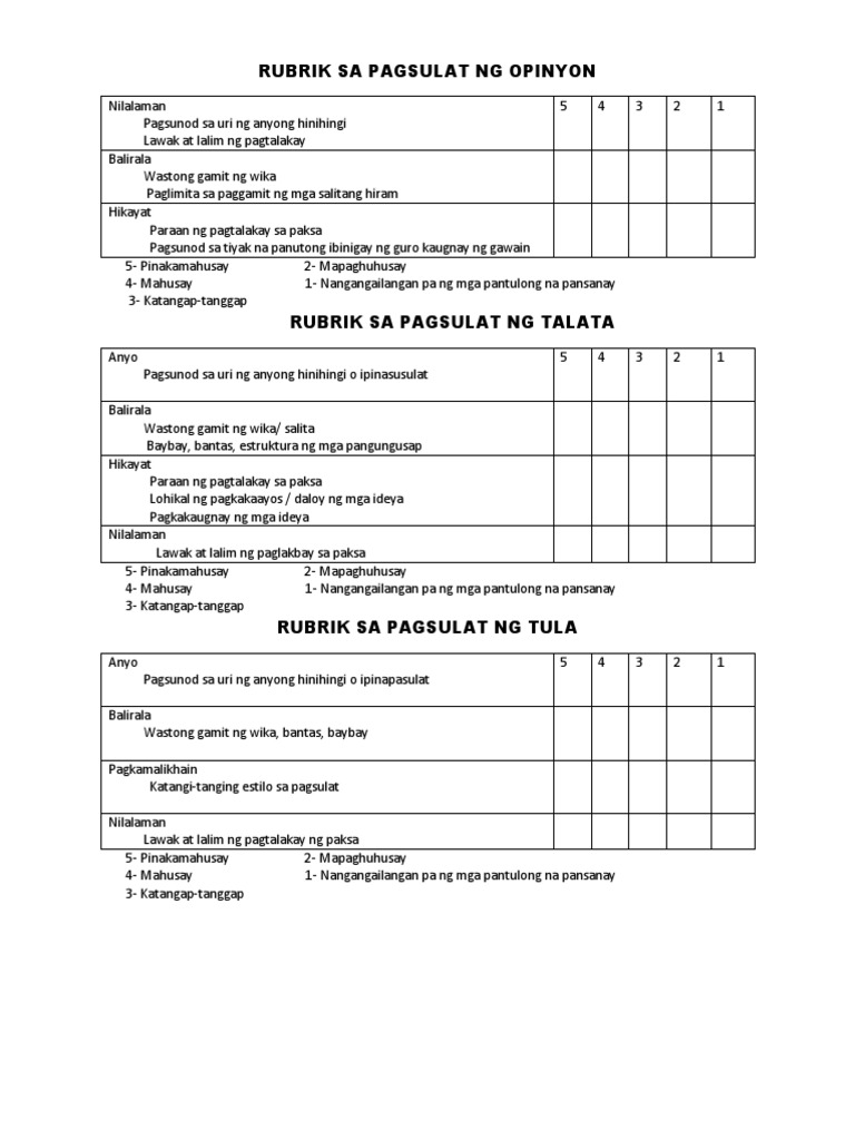 Rubrik Sa Pagsulat Ng Opinyon Pdf
