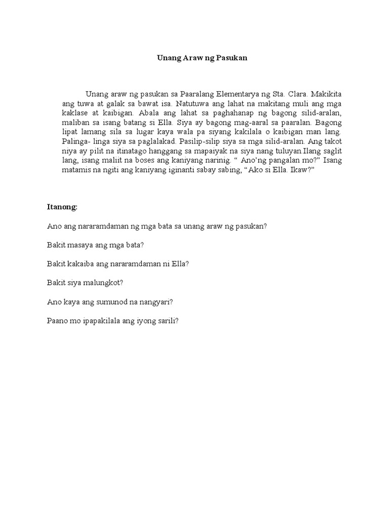 Sanaysay tungkol sa unang araw ng pasukan. May mga pagsusulit rin kayat kinakailngan kong makinig ng husay sa diskusyon. Para sa akin parang bumalik sa umpisa ang lahat na para bang unang araw kong muli sa pagtuturo. Masayang nagkwento si Pedro sa kanyang ina at sinabi Nararamdaman ko po na magiging masaya at makabuluhan ang taon na ito at marami rin po akong magiging bagong mga kaibigan.