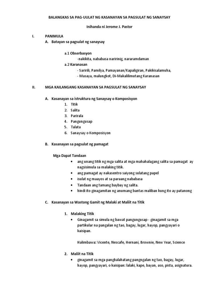 Balangkas Ng Ulat Sa Pagsulat Ng Sanaysay Pdf